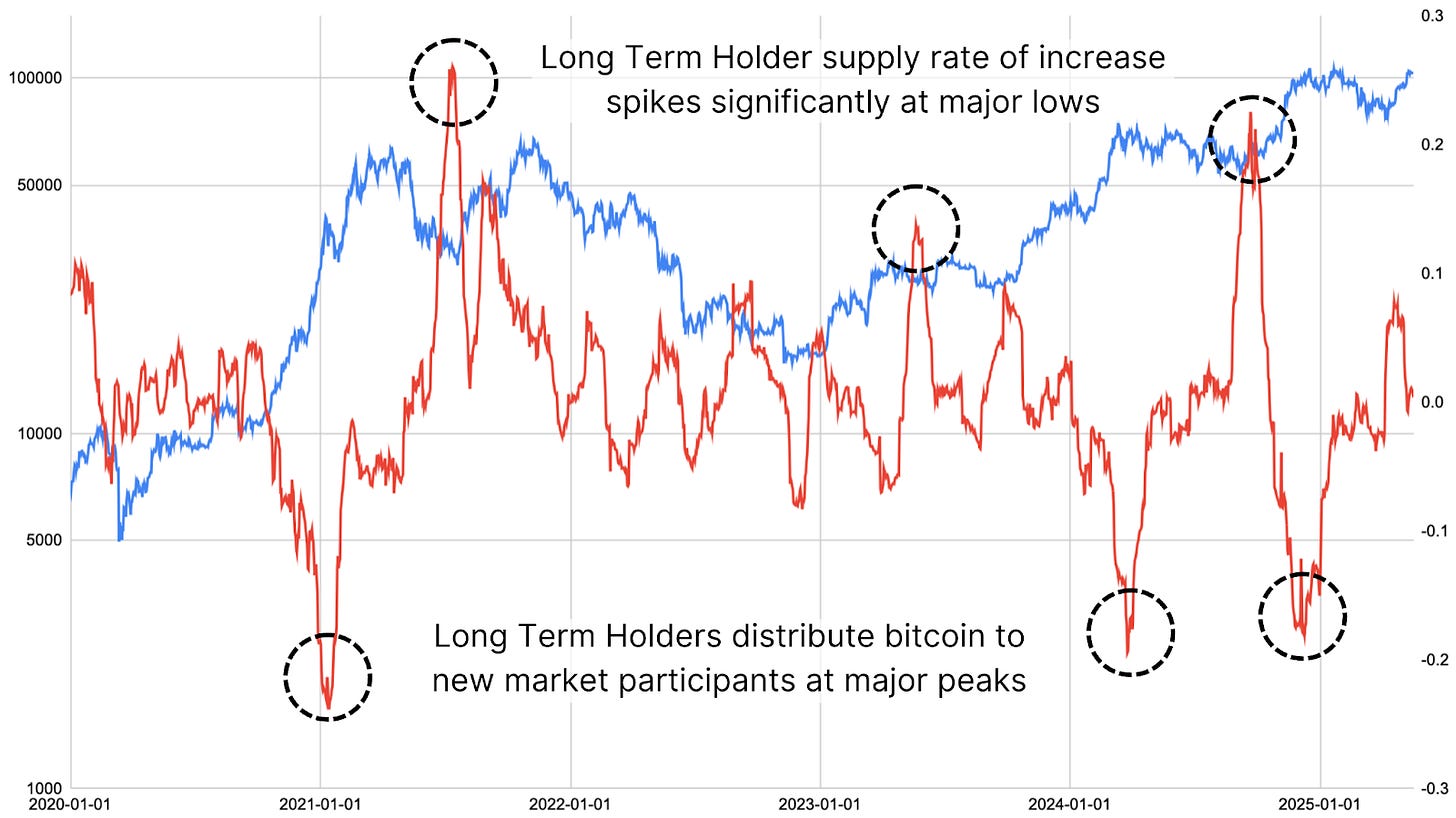 Using raw Bitcoin Magazine Pro API data, we examined the rate of change in long-term holder balances, categorized by wallet age. When this metric trends downward significantly, it has historically coincided with cycle peaks. Conversely, when it spikes upward, it has often marked market bottoms and periods of deep accumulation.