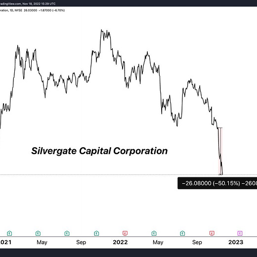 “Who else is at the center of many institutions in the market? Silvergate Bank is one of those. Since the beginning of November, their stock is down nearly 56%. Silvergate Bank is at the nexus of banking services for the entire industry, servicing 1,677 digital asset customers with $9.8 billion in digital asset deposits. FTX accounted for less than 10% of deposits and the CEO has tried to reassure markets that their current loan book has faced zero losses or liquidations so far. Leveraged loans are collateralized with bitcoin that can be liquidated as necessary. Yet, the ongoing risk is a complete bank run on Silvergate deposits.. Although the CEO’s comments sound reassuring, the stock performance over the last two weeks tell a much different story.” — The Contagion Continues: Major Crypto Lender Genesis Is Next On The Chopping Block