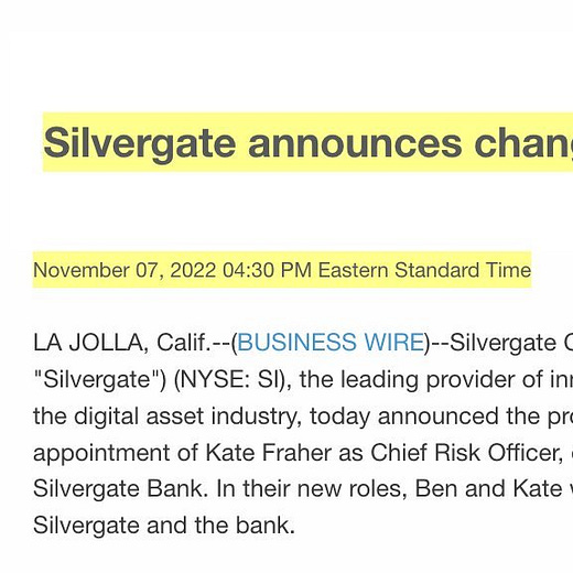 In regard to Silvergate, we have been monitoring the situation closely since November — after the collapse of FTX — as it became apparent that Silvergate played a role in serving FTX and Alameda by giving them access to USD rails.