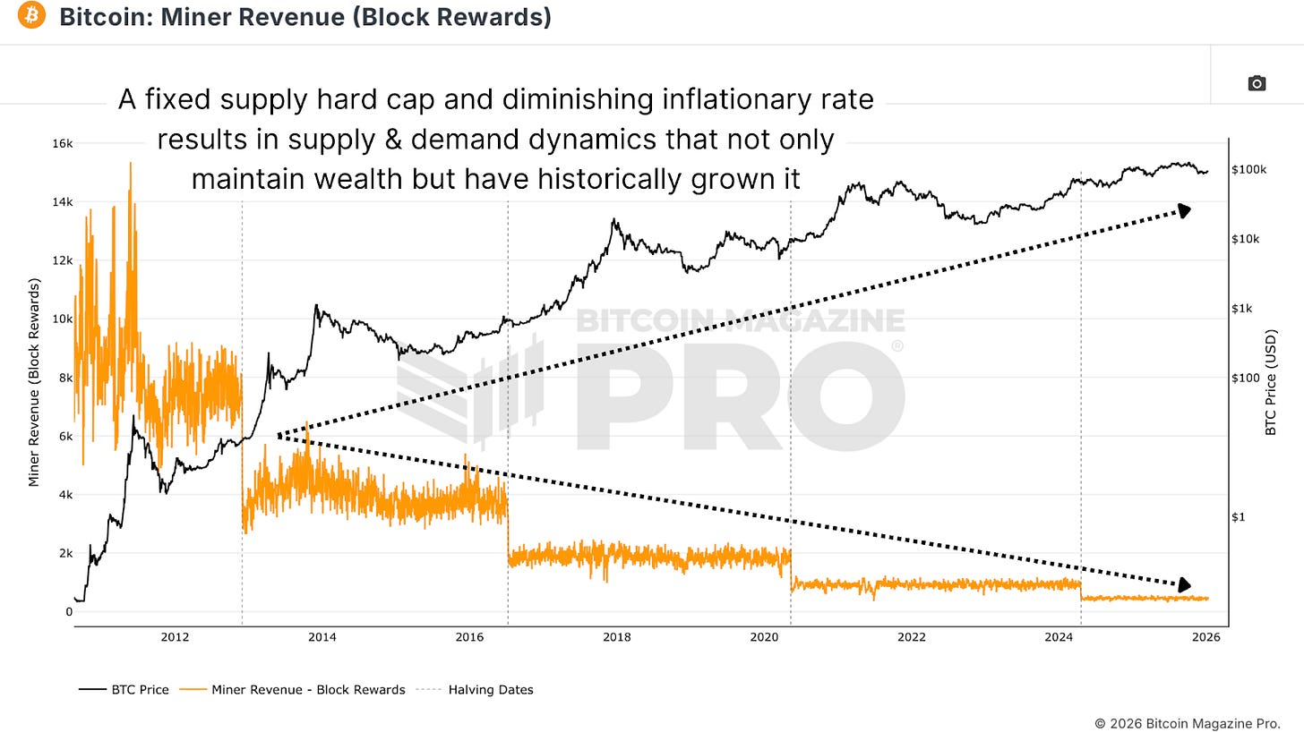 Figure 2: Bitcoin’s periodic halving events limit supply and inflation.