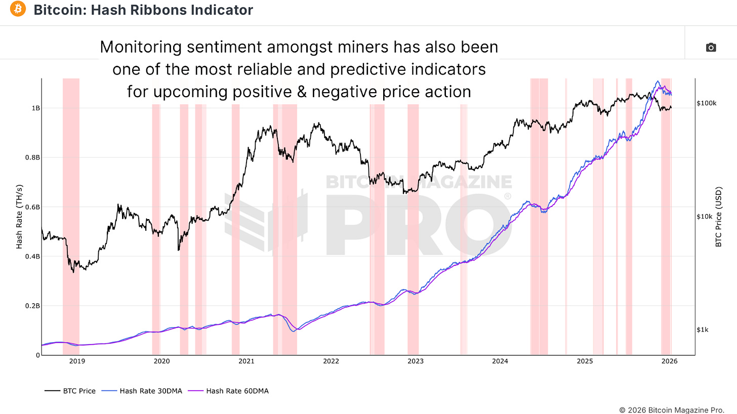 The Hash Ribbons Indicator compares the 30-day average hash rate against the 60-day average hash rate. When the 30-day line crosses below the 60-day line, the background turns red, indicating miners are becoming bearish and turning off machines. This is not sentiment analysis but actual operational decisions by multi-million dollar mining operations and huge public companies that must take price expectations seriously.