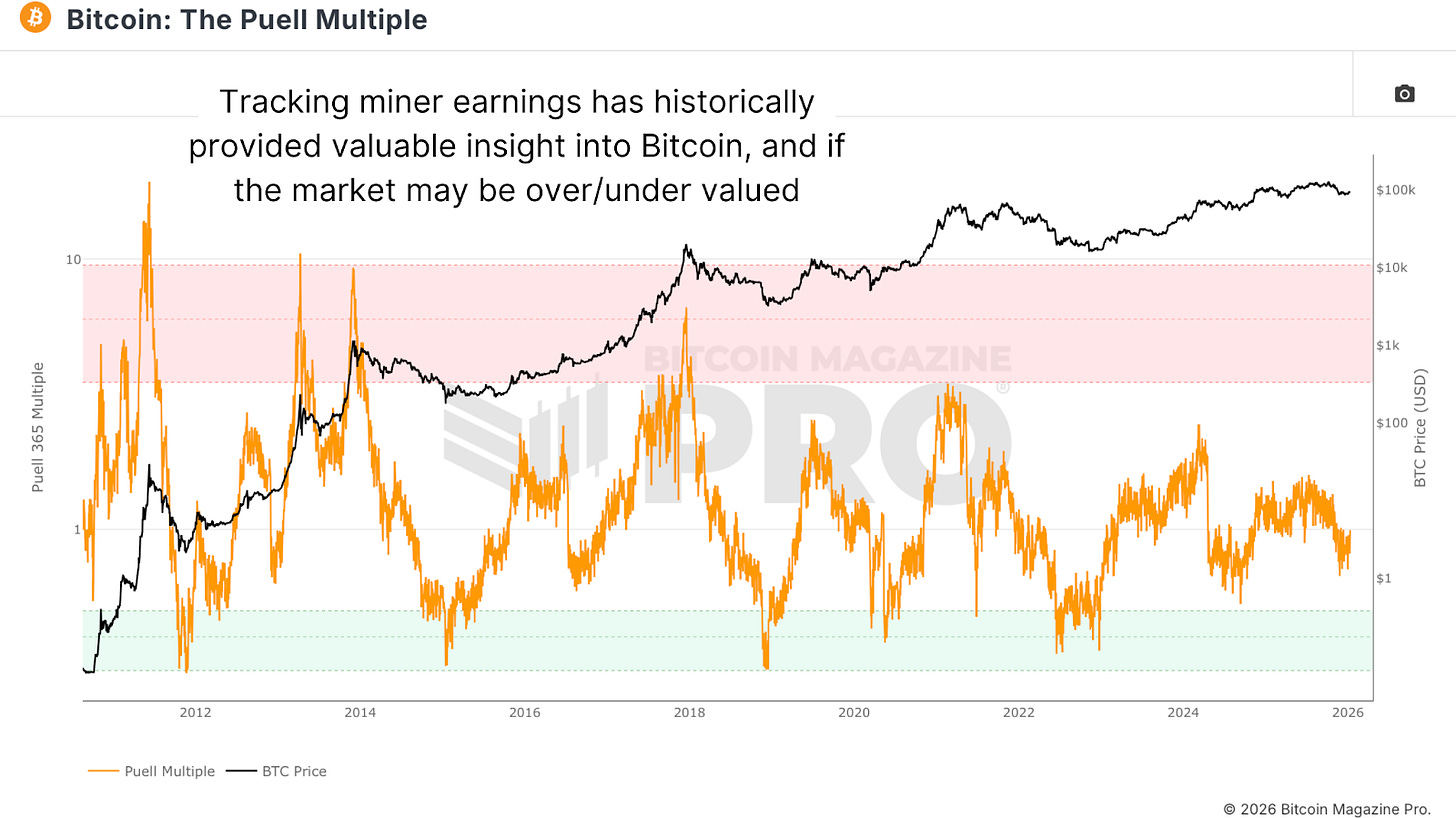 Figure 3: The Puell Multiple uses miner revenues relative to their yearly rolling averages to assess market conditions.