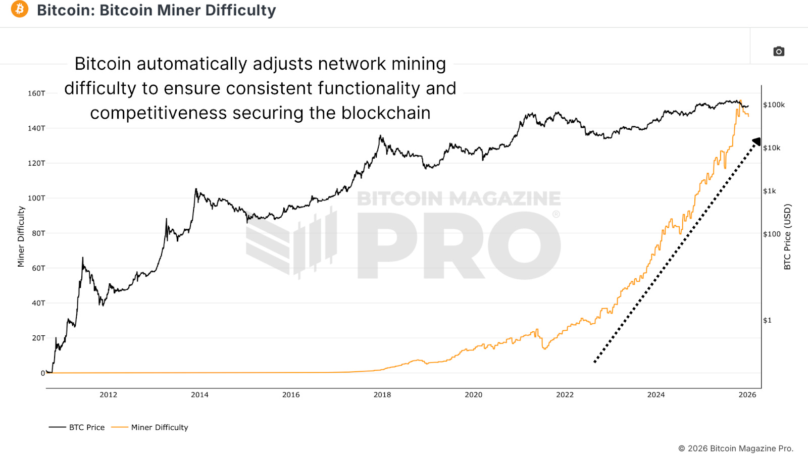 Around every 10 minutes, a new Bitcoin block containing validated transactions is mined. These blocks are stored on Bitcoin’s blockchain, its public ledger that records details of every transaction that has occurred on the platform. We typically refer to activities related to the blockchain as being “on-chain”. Miners compete using specialized computer processing units to solve mathematical problems proving block validity. The miner who successfully solves the block receives a significant reward, creating intense competition reflected in exponentially increasing Bitcoin Miner Difficulty rate (the number of hashes required to find a valid block solution), throughout Bitcoin’s history.
