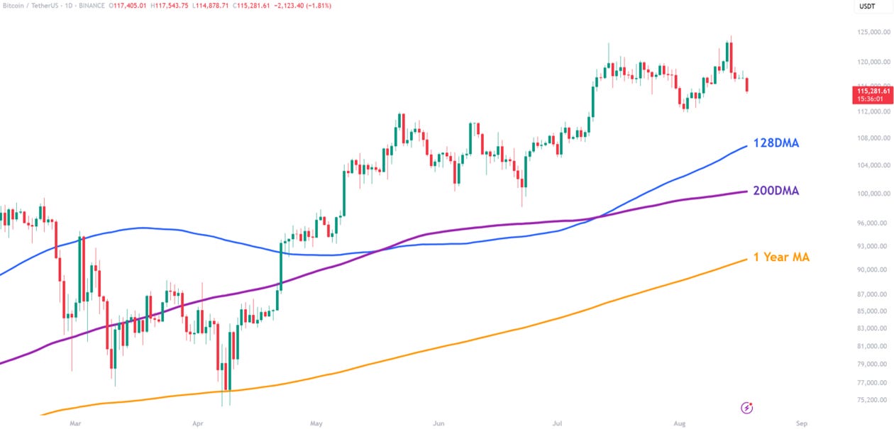 The first is the 128DMA, currently at $107,000. Then followed by the 200DMA at $100,000, followed finally by the 1-year moving average at $91,470. That is THE most critical moving average. Should BTC drop below that 1-year moving average level, then the bull market may well be over.