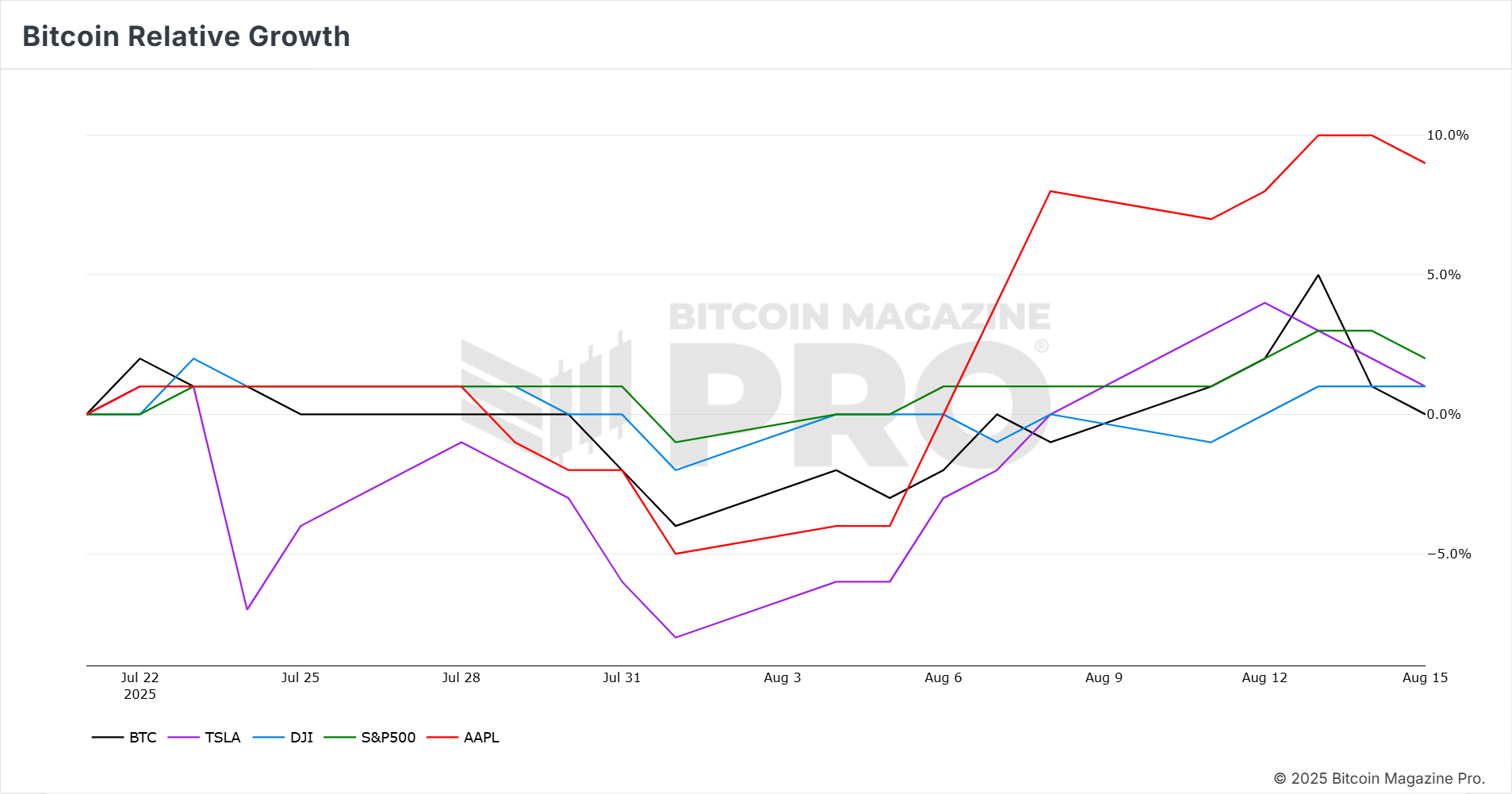 Comparing BTC performance to some leading stocks and indices over that same period, there’s not much in it, with Tesla, S&P500, and Dow Jones all broadly flat along with BTC.