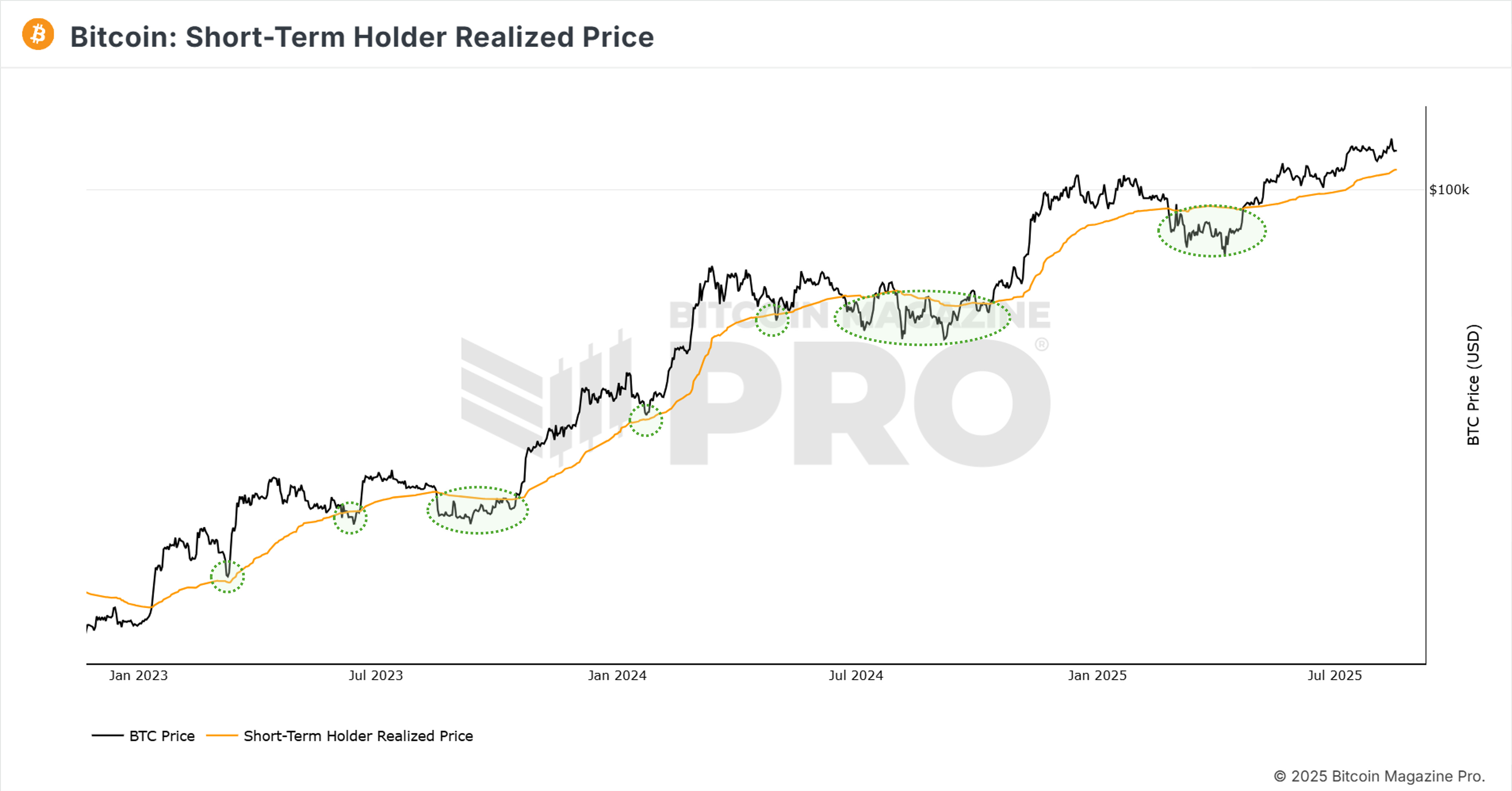 Each time, BTC has then rallied upwards after reaching or dropping just below the Short Term Holder Realized Price.