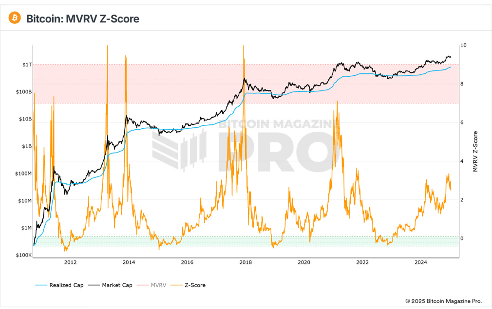 MVRV Z-Score looks at differences between the Market Value of Bitcoin and the Realized Value. The Realized Value is the average cost basis of all bitcoins.
