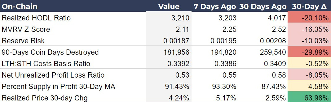 The move bullish on-chain metrics this week are the Reserve Risk, 90-days Coin Days Destroyed and Realized Price 30-day change. I wrote about Reserve Risk in depth in yesterday's post, and as we can see here, it has dropped significantly, increasing the attractiveness of the risk/reward ratio. The 90-Days CDD has plunged 30%, meaning an increase in holding behavior, as fewer LTH coins are moved. Additionally, the Realized Price 30-day change is slightly less than last week, but remains high, signifying an increase in the general inflow into the asset.