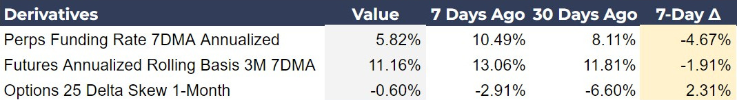 Bitcoin’s derivatives markets are slowing but remain decidedly bullish. The Perps Funding Rate 7DMA Annualized has decreased significantly from 10.49% to 5.82%. This decline suggests a reduced leverage among long positions, risk of volatility to the downside is reduced. Similarly, the Futures Annualized Rolling Basis 3M 7DMA has dropped from 13.06% to 11.16%, a much smaller drop, indicating futures are still quite bullish over the quarterly time frame.