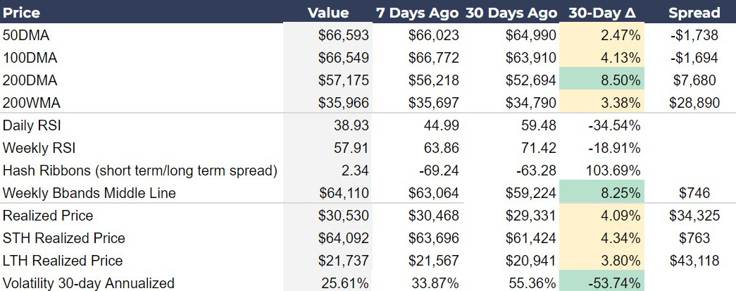 These price metrics in the table are based on Thursday’s close or the most recent weekly close. At the time of writing, price has continued to dip further. Price is threatening the STH Realized Price and the Weekly Bbands mid-line (20-week MA), while also being under the 50-day and 100-day MAs, in a bearish short-term trend.