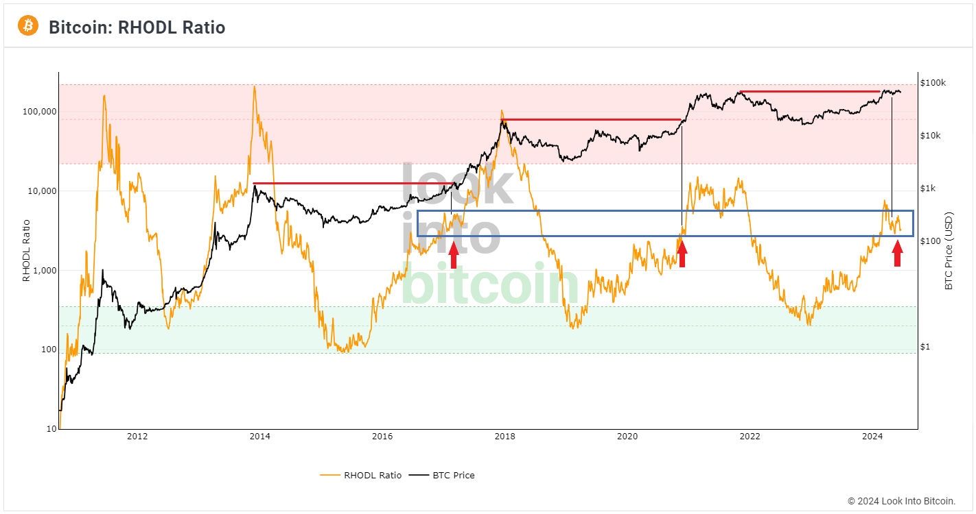Developments in the Realized HODL Ratio and MVRV Z-score are not on the scale of changing our reading of the cycle. They are mid-range, the longer they stay there, one could speculate the stronger the eventual breakout will be. For instance, below I show that in the last two cycles, when price was breaking the previous cycle’s ATH, the Realized HODL Ratio was also in this mid-range area.