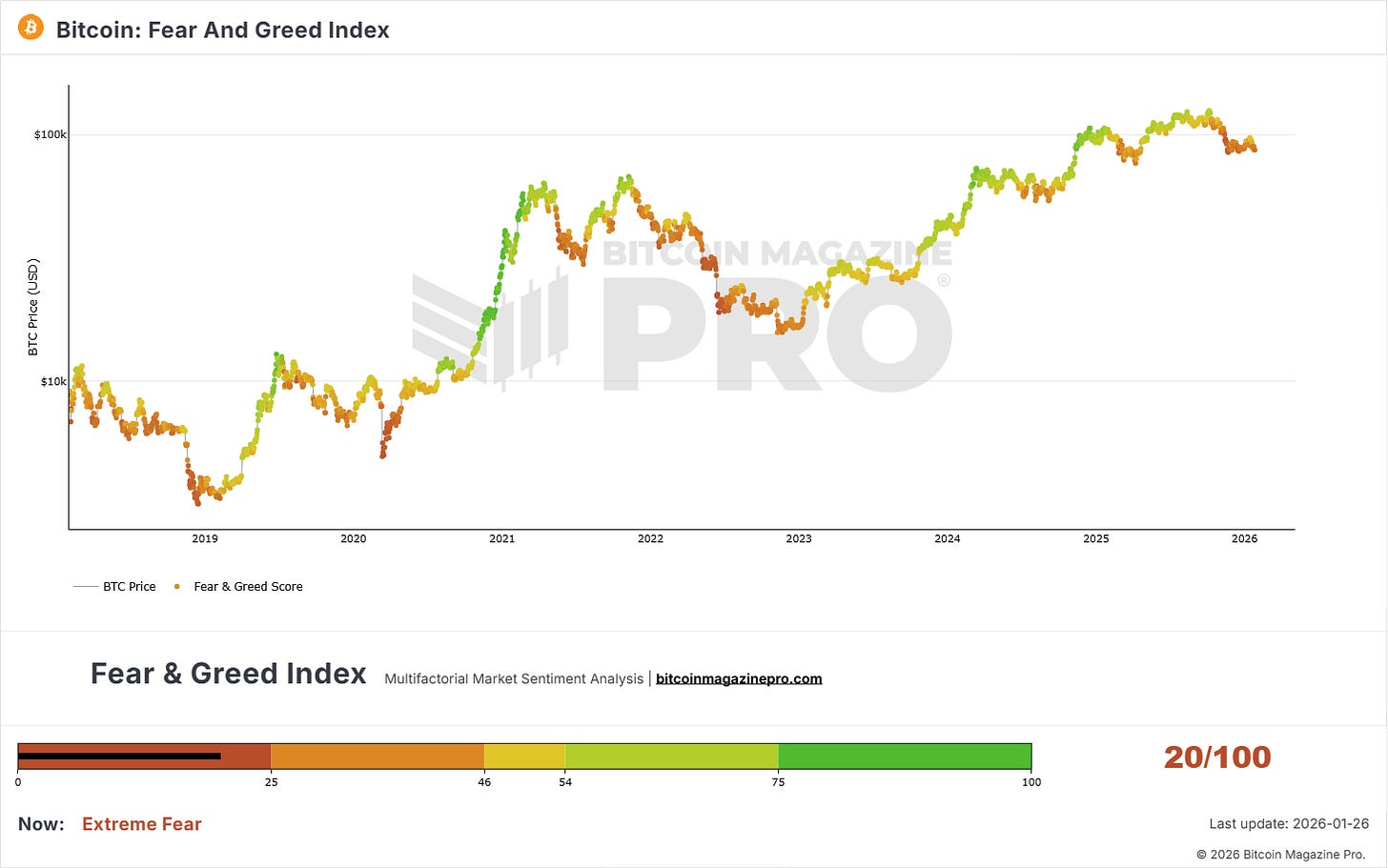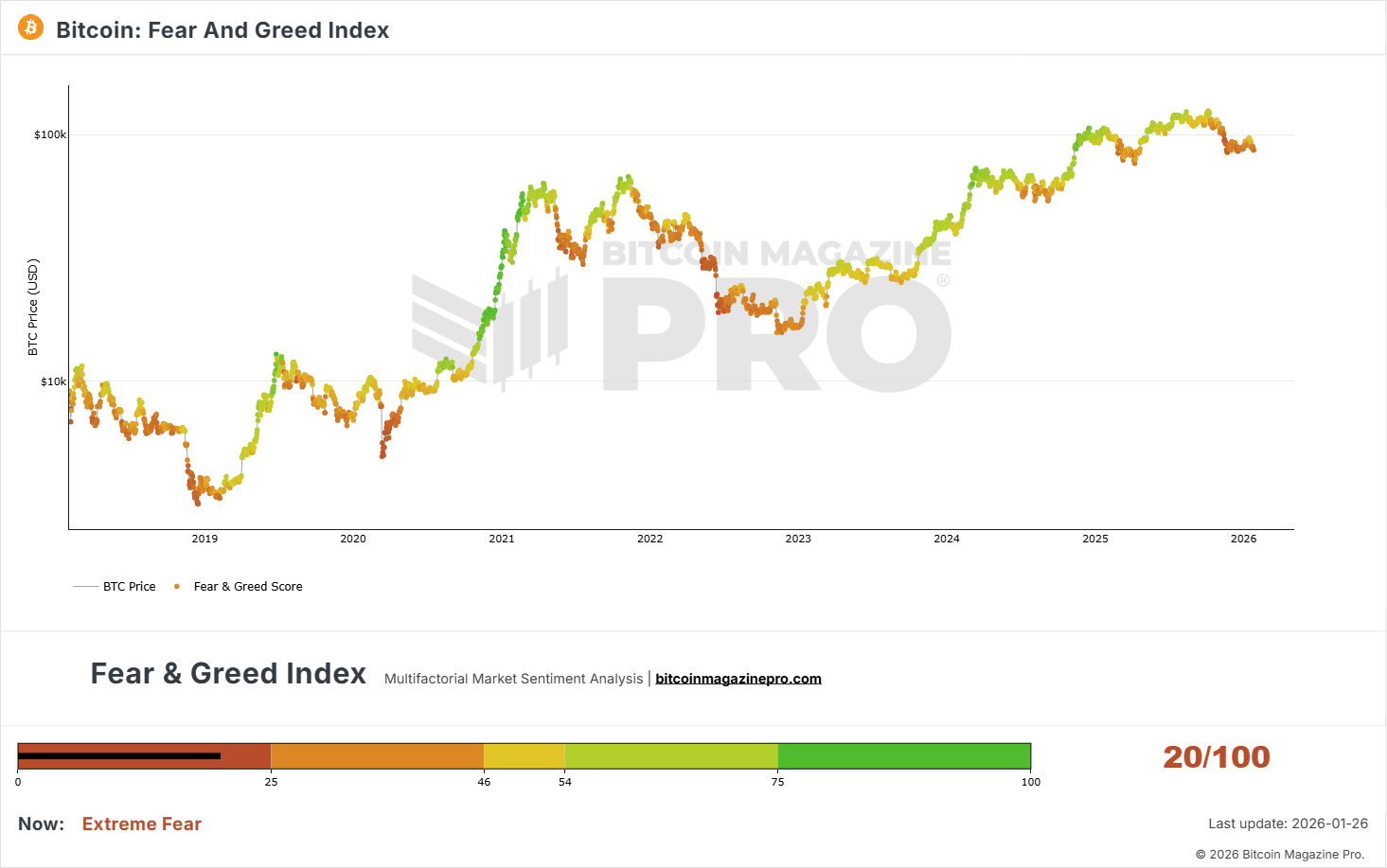 Sentiment reflects this stress. The Fear & Greed Index currently sits at 20, deep in extreme fear.