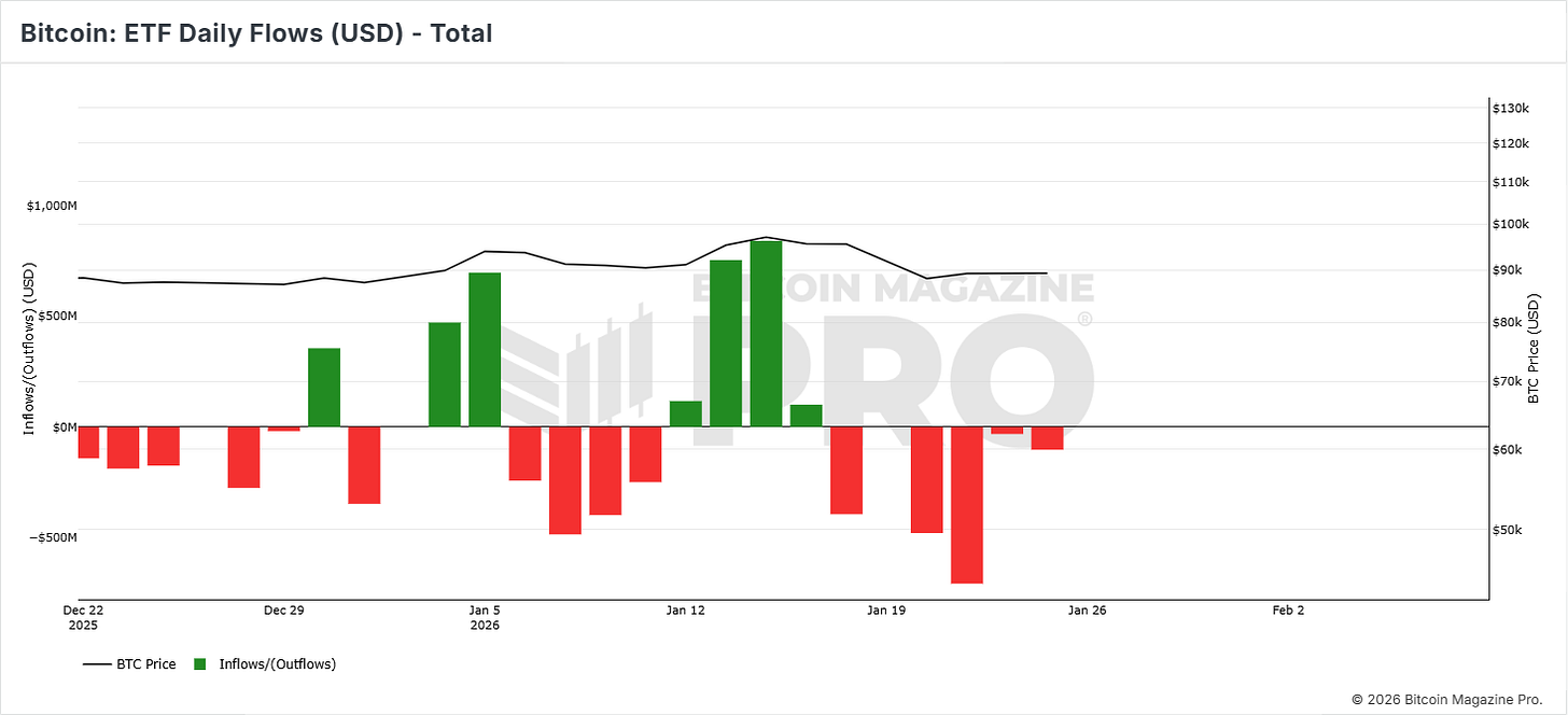 While total inflows remain substantial, the shift in momentum is notable, particularly given the consistent ETF accumulation throughout the past year.