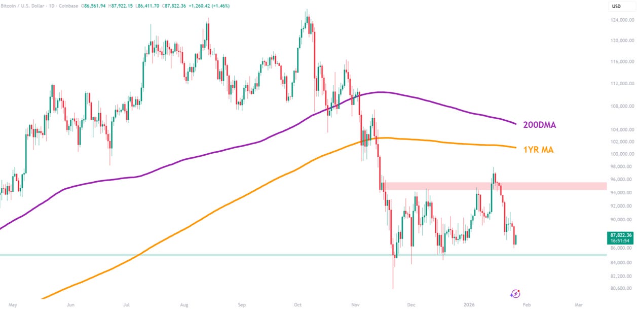 From a technical perspective, after the brief fakeout above the key reversal level of $95,000 (red zone on the chart below), BTC has drifted back to the bottom of the range (green zone).