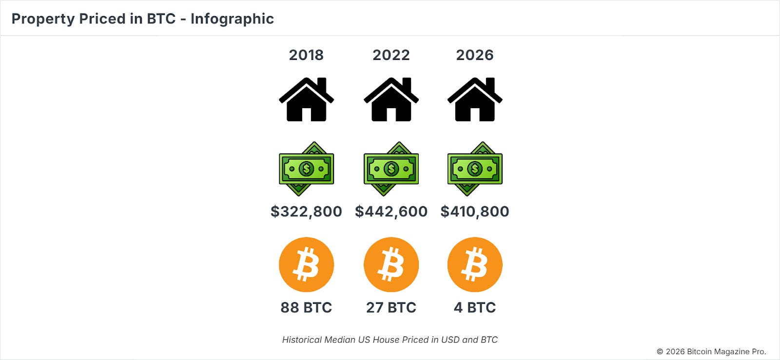 The median US home today costs roughly 4 BTC. In 2018, that same home would have required 88 BTC. Even as recently as a few years ago, buyers needed around 27 BTC to purchase the median US house.