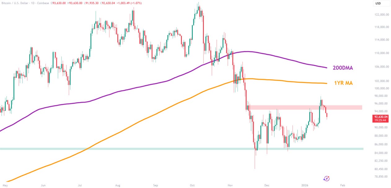 After a brief fakeout above the key reversal level of $95,000 (red zone on the chart below), BTC is now back in its range.