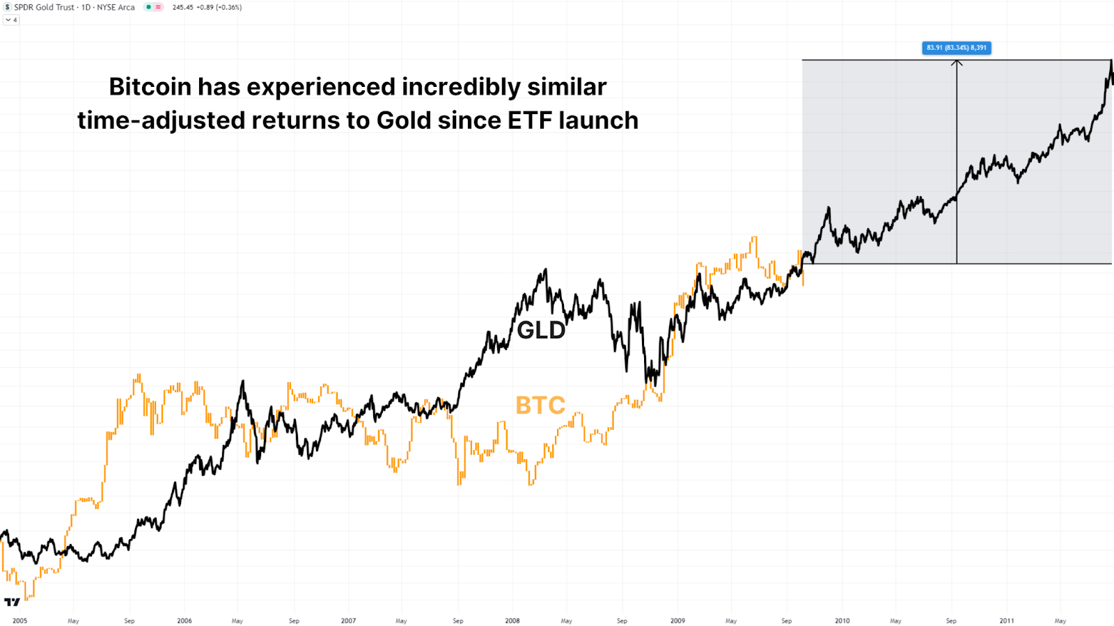 Figure 4: BTC time-adjusted returns to GLD are incredibly similar since ETF approval.