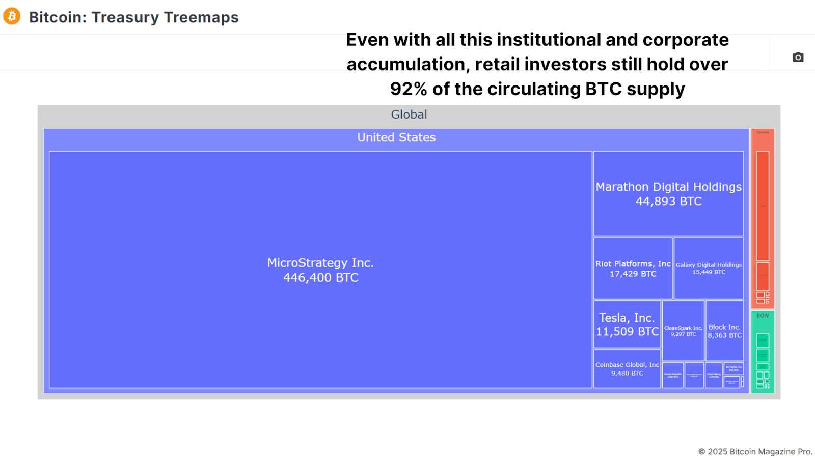 While Bitcoin ETFs have accumulated over 1 million BTC, this represents only a small fraction of Bitcoin’s total circulating supply of 19.8 million BTC. Corporations like MicroStrategy have also contributed to institutional adoption, collectively holding hundreds of thousands of BTC. Yet, the majority of Bitcoin remains in the hands of individual investors, ensuring that market dynamics are still driven by decentralized supply and demand.