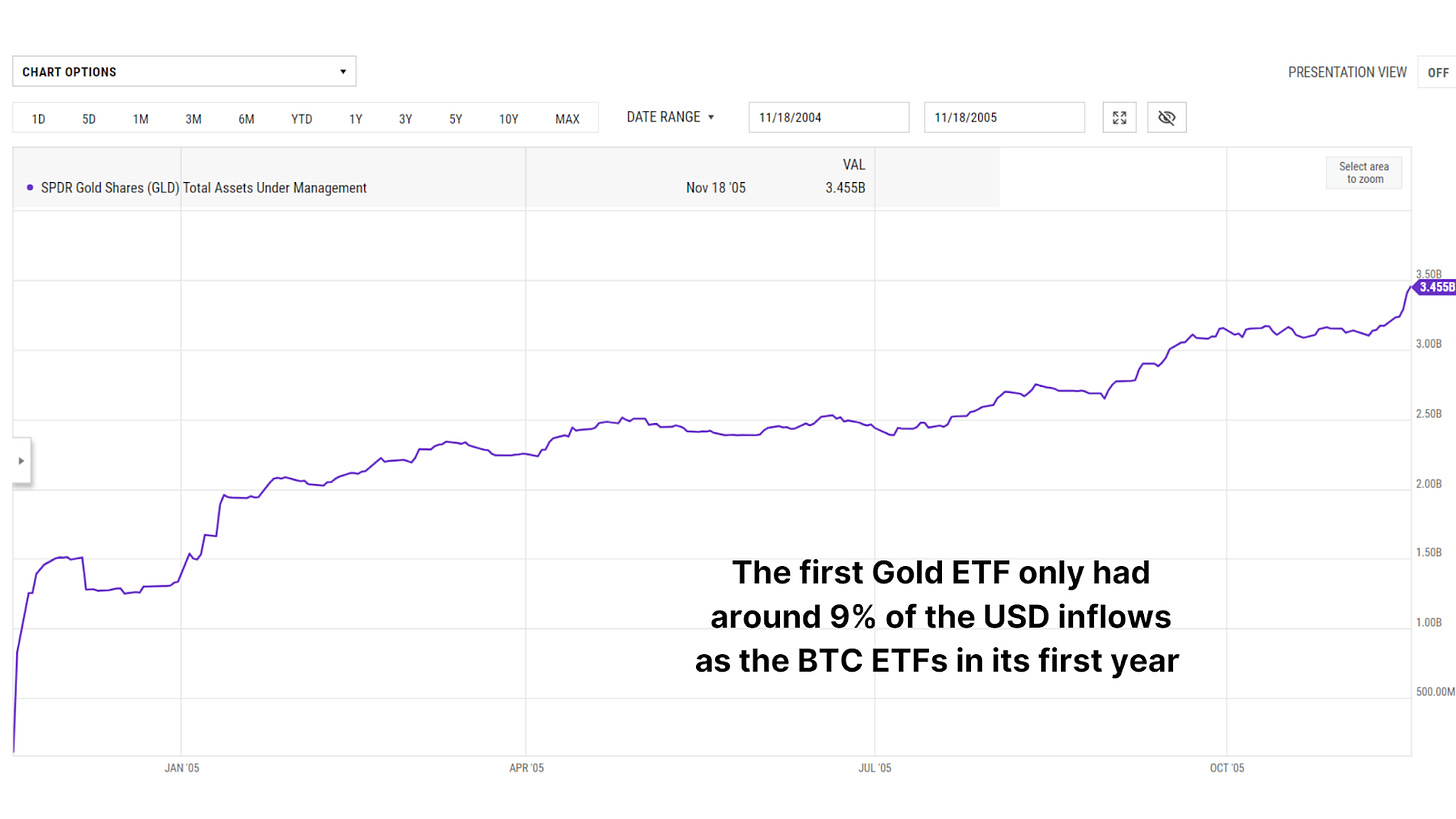 Figure 2: The first Gold ETF accrued less than 1/10th the value of the BTC ETFs in its first year.