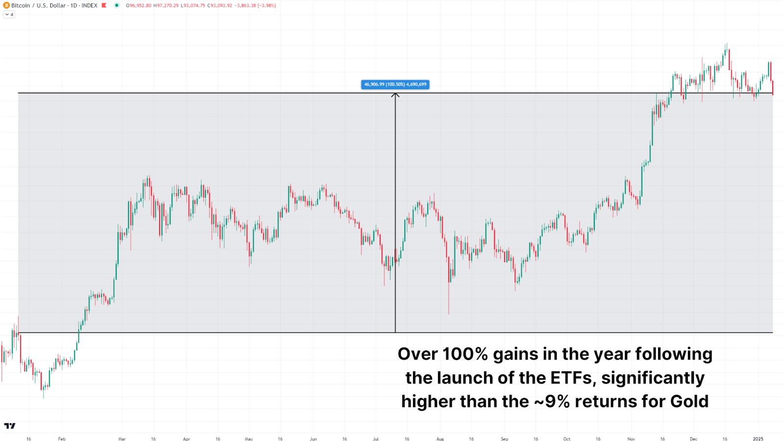 Following the launch of Bitcoin ETFs, initial price movements were underwhelming, with Bitcoin briefly declining by nearly 20% in a "buy the rumor, sell the news" scenario. However, this bearish trend quickly reversed. Over the past year, Bitcoin prices have risen by approximately 120%, reaching new heights. For comparison, the first year following the launch of gold ETFs saw a modest 9% price increase for gold.