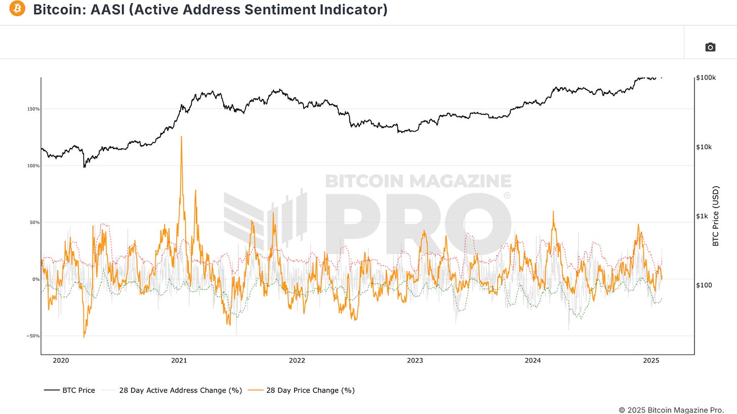 Network usage can offer vital clues about Bitcoin’s strength. The Active Address Sentiment Indicator measures the percentage change in active addresses over 28 days. A rise in active addresses generally confirms a bullish trend, while stagnation or decline may signal price weakness.
