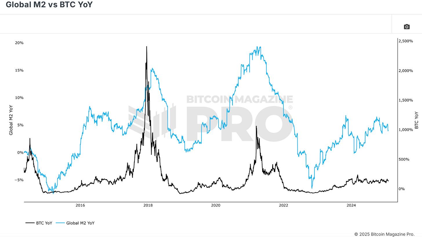 Bitcoin's price action is deeply influenced by global liquidity cycles, making macroeconomic conditions a fundamental pillar of this indicator. The correlation between Bitcoin and broader financial markets, especially in terms of Global M2 money supply, is clear. When liquidity expands, Bitcoin typically appreciates.