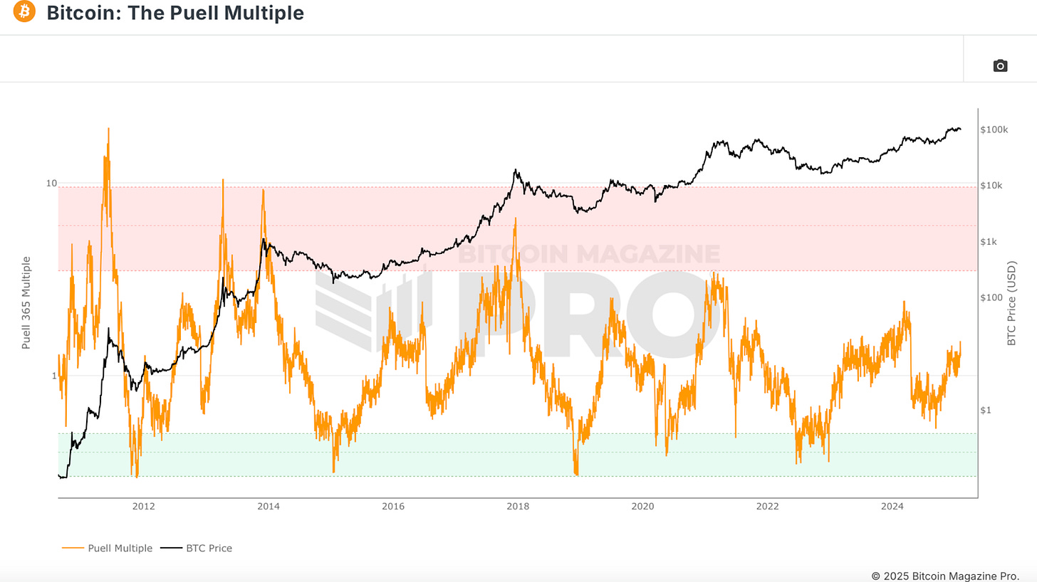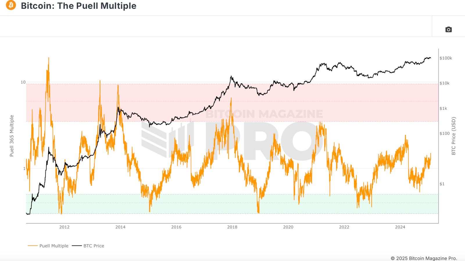 Fundamental factors like Bitcoin’s halving cycles and miner strength play an essential role in its valuation. While halvings decrease new Bitcoin supply, their impact on price appreciation has diminished as over 94% of Bitcoin’s total supply is already in circulation. However, miner profitability remains crucial. The Puell Multiple, which measures miner revenue relative to historical averages, provides insights into market cycles. Historically, when miner profitability is strong, Bitcoin tends to be in a favorable position.