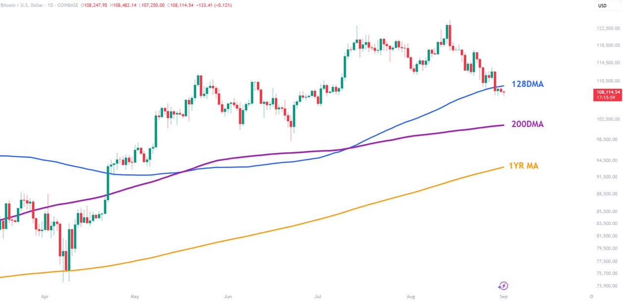 Currently, BTC is sitting just underneath the 128-day moving average. Bulls will want to see a quick reclaim of that level. From a pure moving average perspective, the next significant support level is the 200-day moving average, which is at $101,302 and climbing.