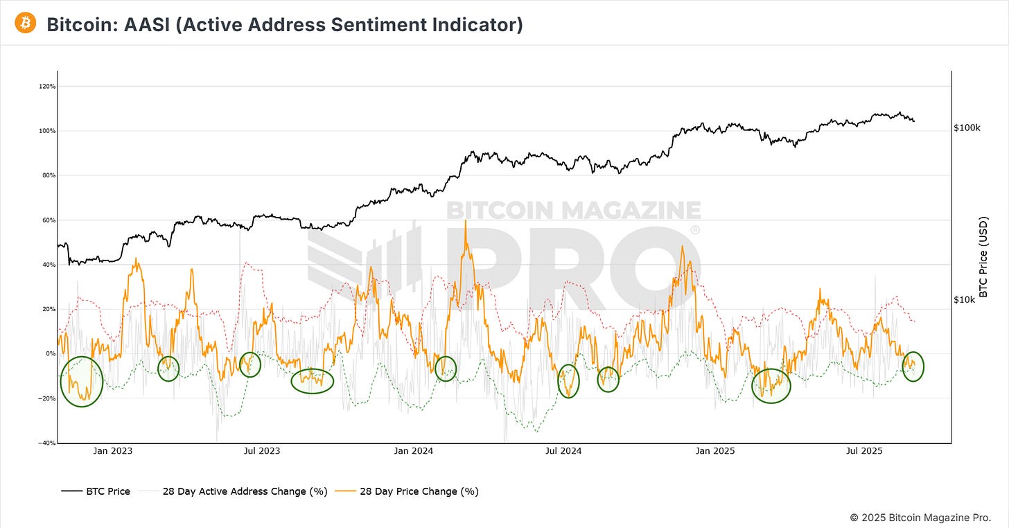 The AASI measures whether network activity (active addresses) is aligned with price action. When addresses grow faster than price, it signals strong sentiment; when they lag, it suggests weakness.