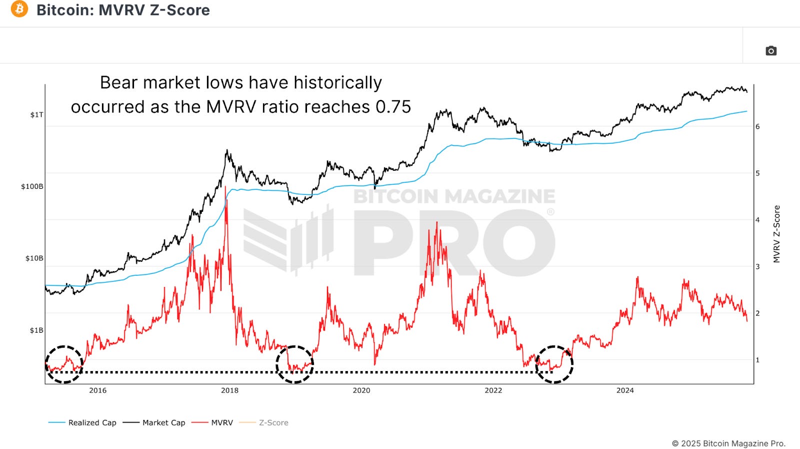 Alongside this, we can look at the raw MVRV Ratio, which measures Bitcoin’s market price versus its realized price (the average cost basis of all coins). Historically, during deep bear markets, Bitcoin tends to fall to 0.75x of its realized price, meaning the market price trades about 25% below the network’s aggregate cost basis.