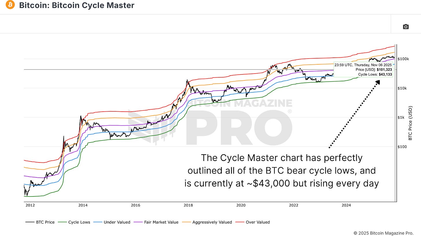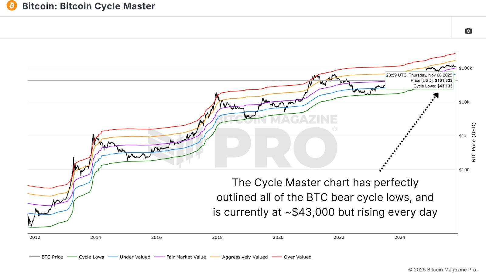 Figure 1: The Cycle Lows line on the Bitcoin Cycle Master chart has accurately aligned with bear cycle lows.