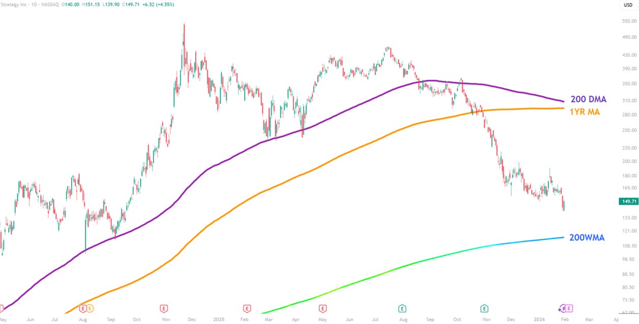 However, until momentum decisively shifts, Strategy remains a high beta proxy for Bitcoin itself, amplified on both the upside and the downside. For now, attention remains focused on key long-term moving averages and whether the market is willing to reprice Bitcoin treasury exposure back into favor.
