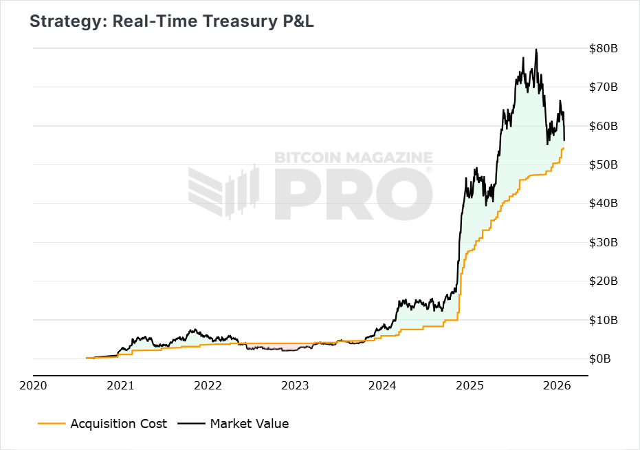 From a Bitcoin profitability perspective, the company is now hovering close to break-even. Strategy’s aggregate Bitcoin cost basis sits around $54.1 billion, while its real-time treasury valuation is approximately $56.1 billion. This leaves the company with a modest unrealized profit of roughly $2 billion.