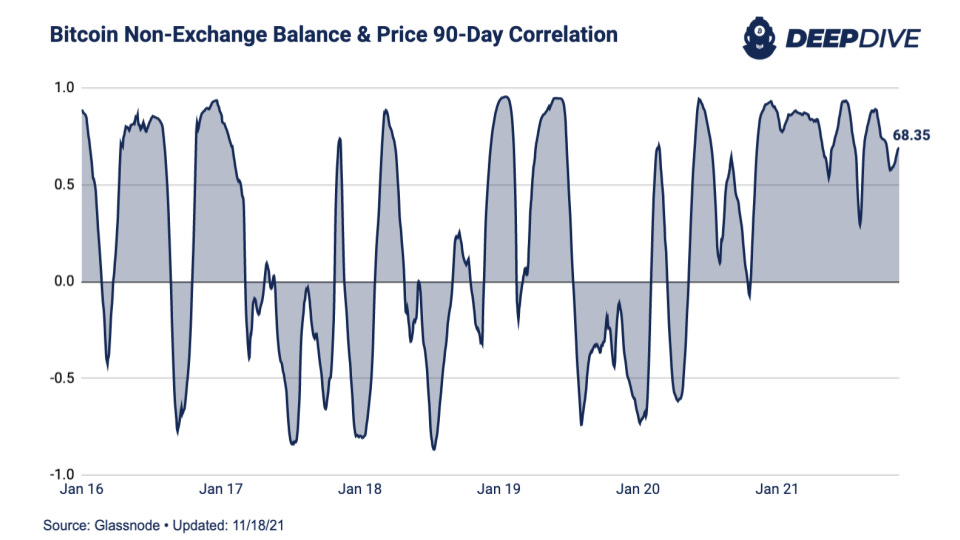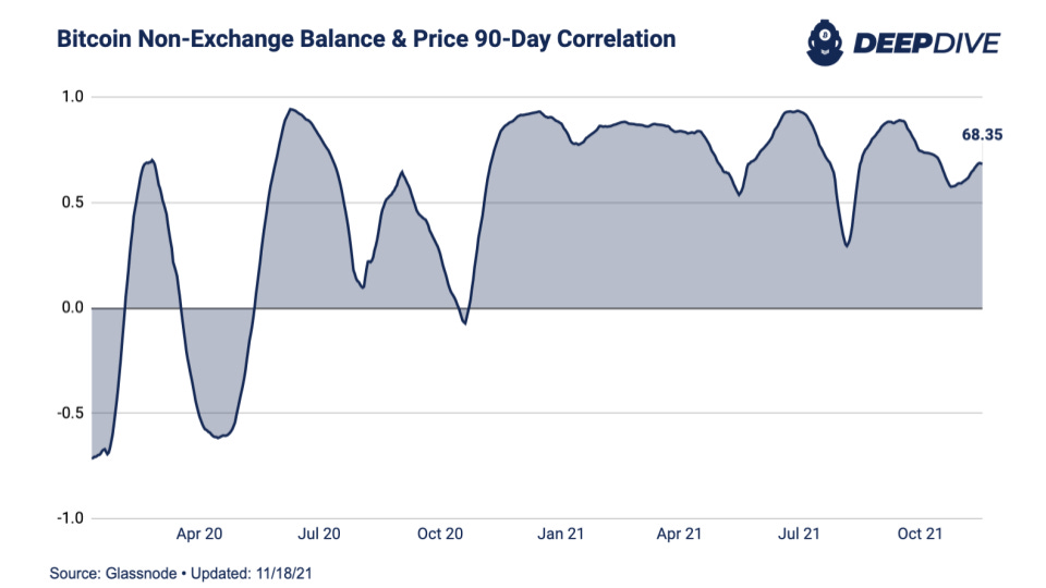 With balances on exchanges hitting new lows, non-exchange balances are rising. A couple of months after the secular market shift in March 2020, there has been a rising, sustained correlation between non-exchange balances and bitcoin price. This is a unique period compared to the last five years. It’s another way to illustrate the supply shock dynamics’ effect on price that we’ve discussed before. In bitcoin’s history, we’ve never seen bitcoin leave exchanges at this rate. Assuming that bitcoin is off the market, less supply is available to buy which puts upward pressure on price as new demand enters.