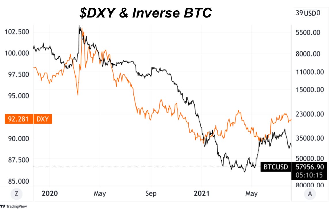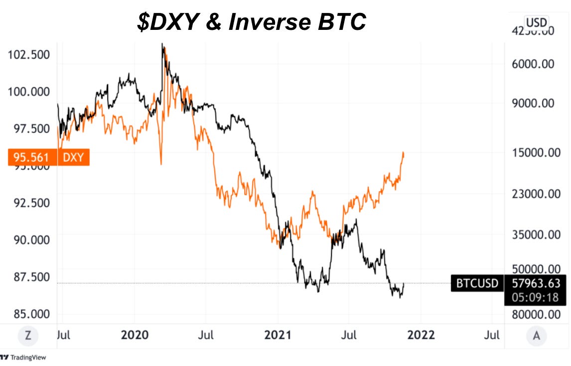 Notably, throughout much of 2020, the DXY and bitcoin were very closely inversely correlated, as a weakening dollar served as a boon for all dollar-denominated financial assets. Since then however, the two have diverged, with the DXY rising through much of 2021 in tandem with the price of bitcoin.