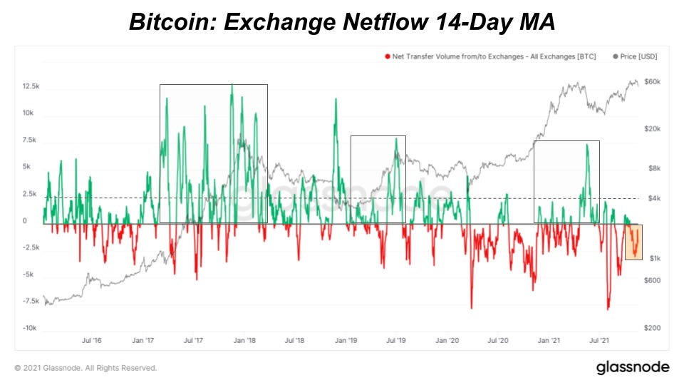 Another way to view exchange balance activity is to look at the daily netflow volume that can be inflows or outflows. Exchange wallets and addresses are classified using proprietary data science, statistics and clustering techniques from Glassnode. Generally, we want to be cautious with interpreting this data as exchange classifications are difficult to do and constantly change as exchange practices change. For example, let’s say there’s an alert that shows 10,000 BTC outflowing from an exchange on a specific day. It’s best to wait a few days for confirmation that this is not an unclassified internal exchange wallet transfer.