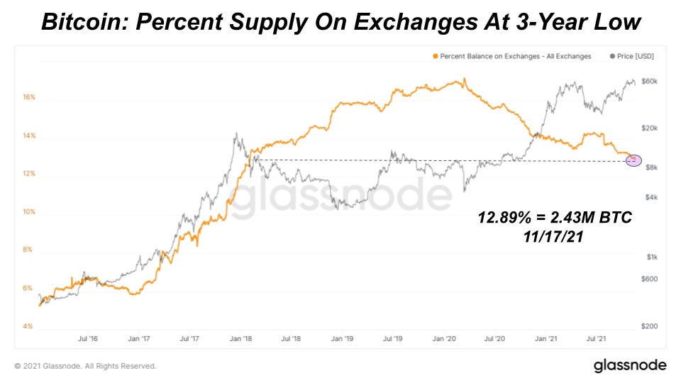 With bitcoin price falling below $60,000, let’s revisit the current state of exchange balances and bitcoin exchange flow activity. At a macro level, the decline in bitcoin supply on exchanges continues with the percentage of bitcoin on exchanges of circulating supply hitting another three-year low yesterday. The secular exchange balance decline that started in March 2020 has not changed.