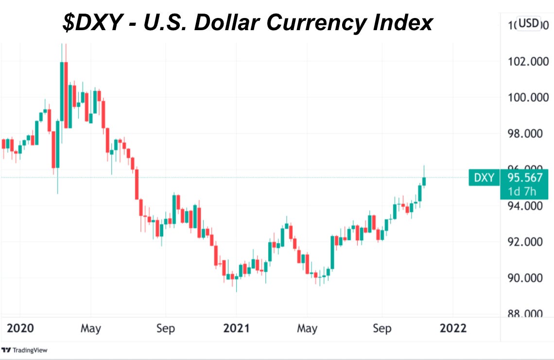 The DXY (U.S. Dollar Currency Index), which measures the value of the USD against a basket of other fiat currencies, has continued to strengthen over the course of 2021, currently trading at 95.57.