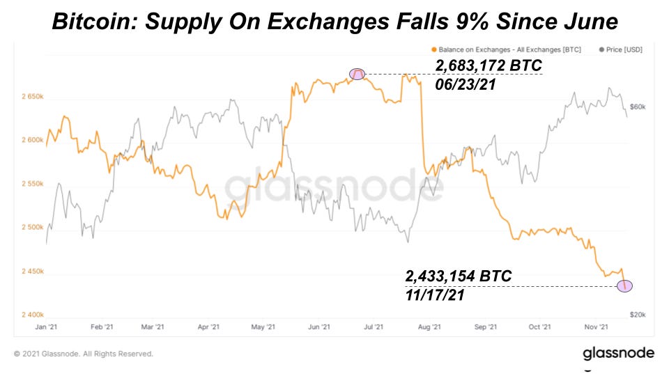 During the previous all-time high over the summer, we saw an exchange supply percentage increase as more bitcoin flowed into exchanges to sell the top. Yet, exchange balance supply has fallen 9%, over 250,000 BTC, since the June peak this year and looks like it is continuing the trend. If this were the macro cycle top, we would expect to see more bitcoin flowing into exchanges to sell.