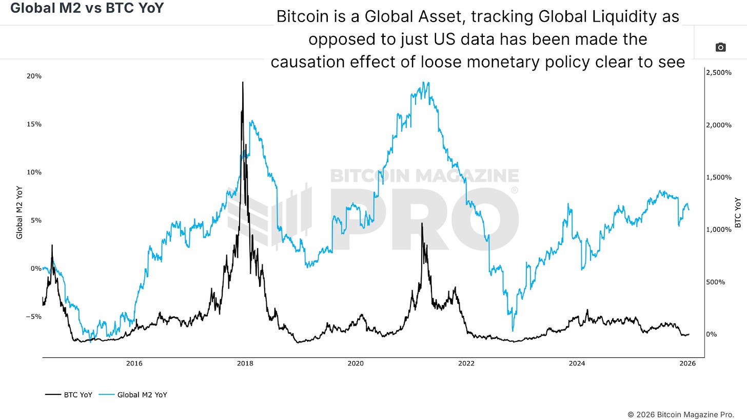 Global M2 year-on-year growth has coincided almost perfectly with Bitcoin’s expansion periods and brutal bear markets. This metric matters because Bitcoin is a global asset, not limited to US investors. Global monetary policy, not just US Federal Reserve policy, drives Bitcoin’s macroeconomic backdrop.