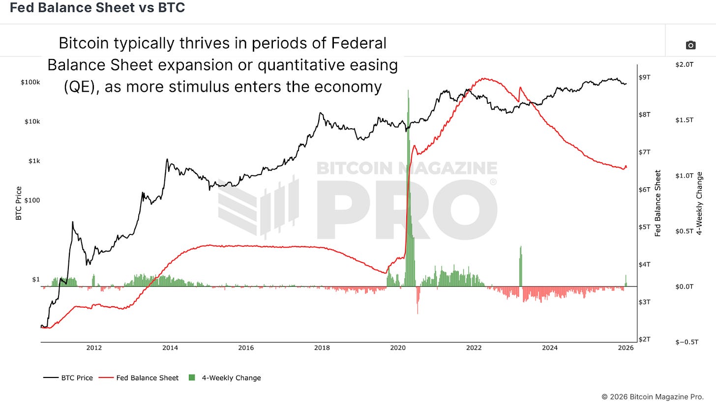 Bitcoin shows an incredibly strong positive correlation with the S&P 500, meaning the two typically move together. As equities rise, Bitcoin tends to rise. As equities fall, Bitcoin typically falls. This correlation suggests that understanding the factors influencing equity markets is essential for Bitcoin analysis. The Federal Reserve Balance Sheet provides critical insight into monetary conditions. During quantitative tightening periods when the balance sheet contracts and liquidity constraints limit speculative appetite, Bitcoin typically faces limited upside potential. Conversely, quantitative easing periods characterized by rapid balance sheet expansion, when abundant liquidity encourages risk-taking, typically coincide with bullish Bitcoin performance.