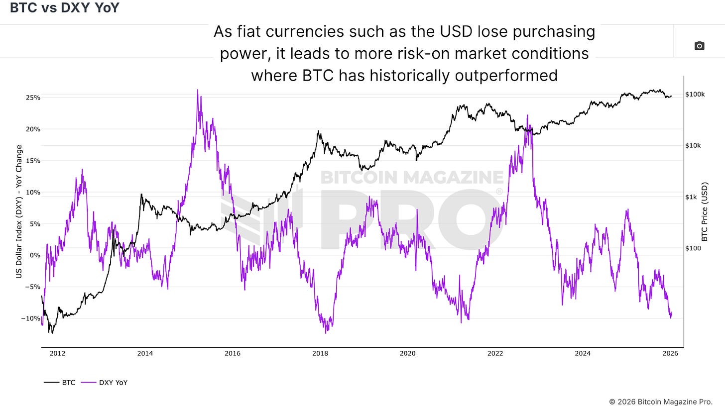 The US Dollar Strength Index (DXY) measures the relative purchasing power of the US dollar compared to a basket of other fiat currencies. Examining DXY year-on-year changes provides superior insight than absolute levels. Bitcoin shows inverse correlation to the DXY. When the DXY weakens year-on-year, it signals favorable conditions for Bitcoin. A weakening dollar makes hard assets like Bitcoin more attractive as dollar holders seek to preserve purchasing power. But when the DXY strengthens year-on-year, it signals headwinds for Bitcoin.