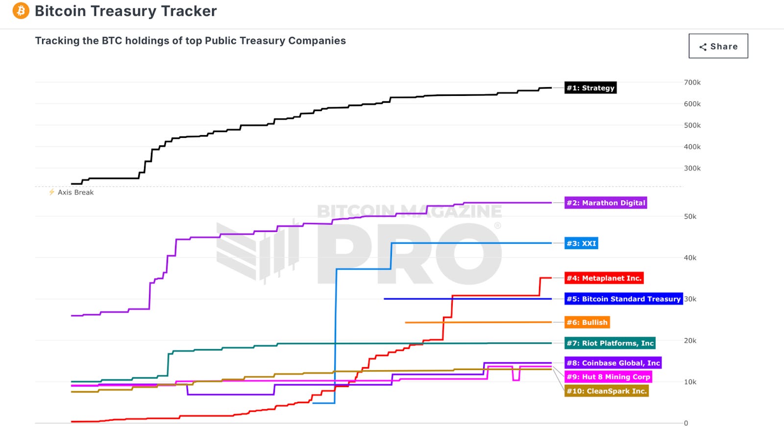 Figure 5: The Bitcoin Treasury Tracker shows the BTC accumulations of the top 10 public treasury companies.