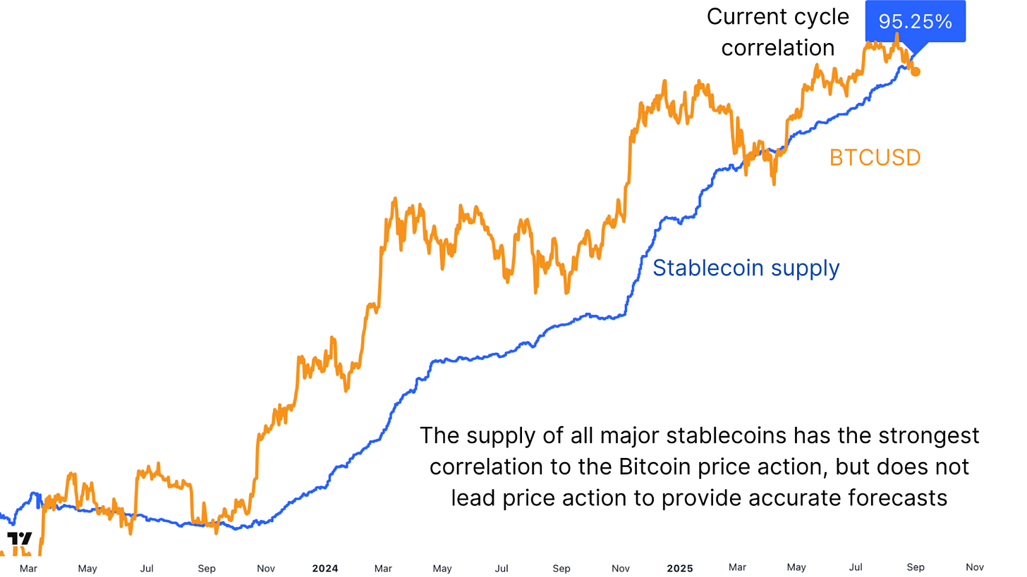 While Global Liquidity reflects the broader macro environment, stablecoin supply provides a more direct view of capital ready to enter digital assets. When USDT, USDC, and other stablecoins are minted in large amounts, this represents “dry powder” waiting to rotate into Bitcoin, and eventually more speculative altcoins. Surprisingly, the correlation here is even stronger than M2 at 95.24% without any offset. Every major inflow of stablecoin liquidity has preceded or accompanied a surge in Bitcoin’s price.