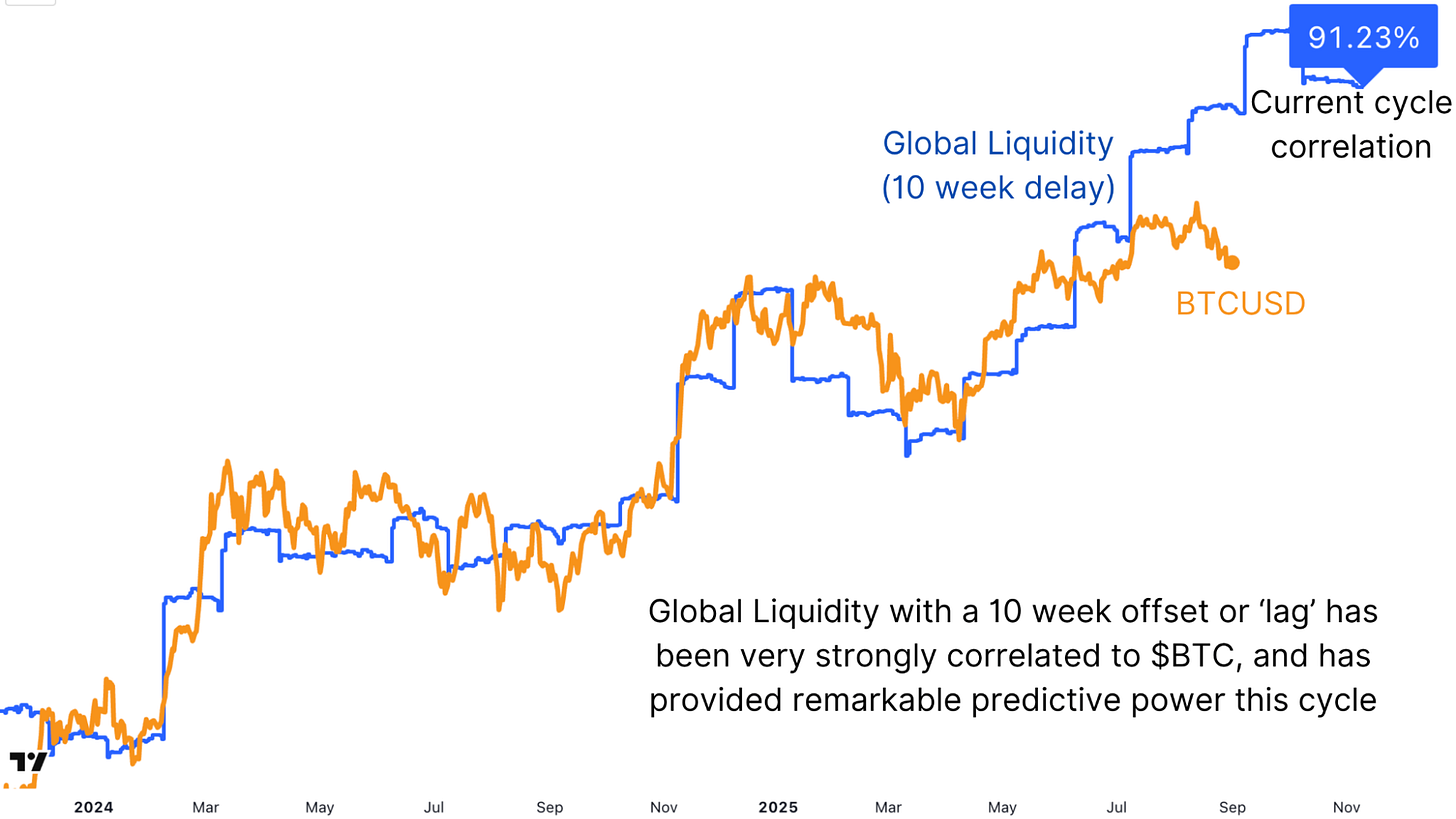 Still, there has been a notable divergence recently. Liquidity continues to rise, signaling support for higher Bitcoin prices, yet Bitcoin itself has stalled after making new all-time highs. This divergence is worth monitoring, but it doesn’t invalidate the broader relationship. In fact, it may suggest that Bitcoin is simply lagging behind liquidity conditions, as it has done at other points in the cycle.