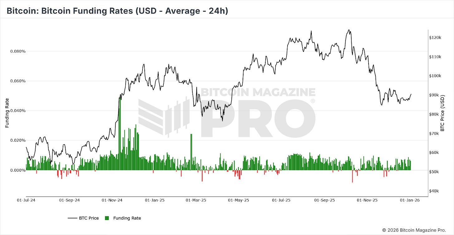In November and December, as Bitcoin lost its 1-year moving average and dropped below $100k, funding rates turned negative (red bars on the charts). This typically occurs during periods of panic, when derivatives traders expect further downside and position defensively by hedging or going short.