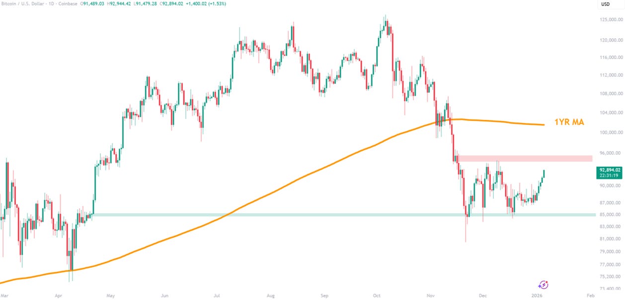Bitcoin has been rallying higher into the new year. BTC is up +5.12% over the last week and is now at $92,345.