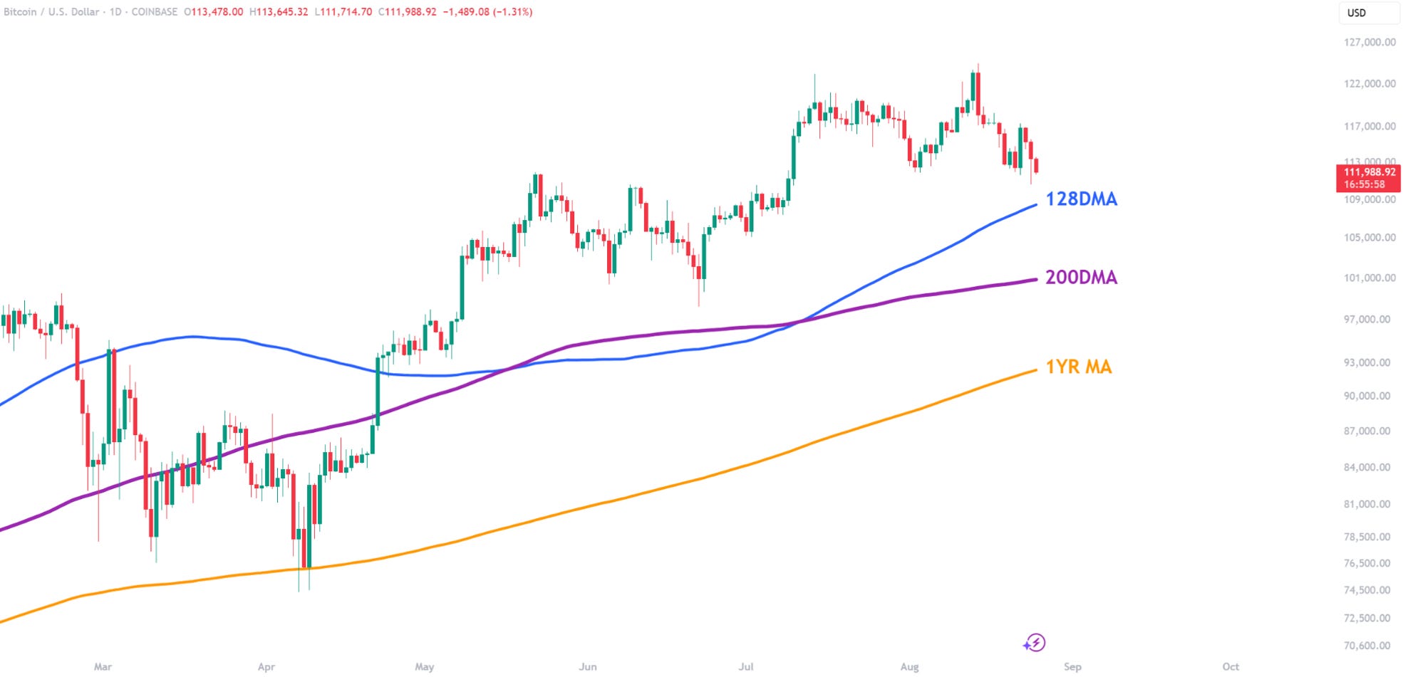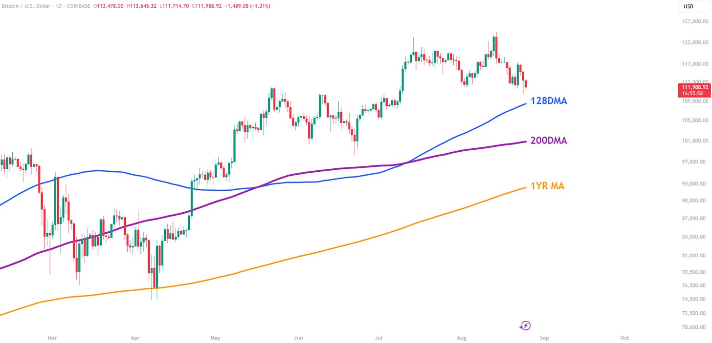 Currently at $112,000, BTC price is holding just above the first significant support level of the 128-day moving average, which is currently at $108,500.
