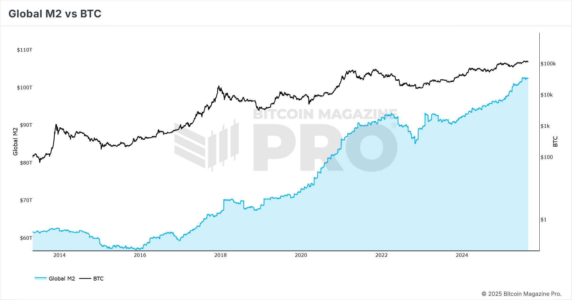 At the same time, global liquidity continues to rise. Central banks, facing fragile economies and mounting debt burdens, are unlikely to stop printing. (See chart below.) More liquidity in the system has consistently been bullish for Bitcoin, which stands apart as a hard asset with a fixed supply.